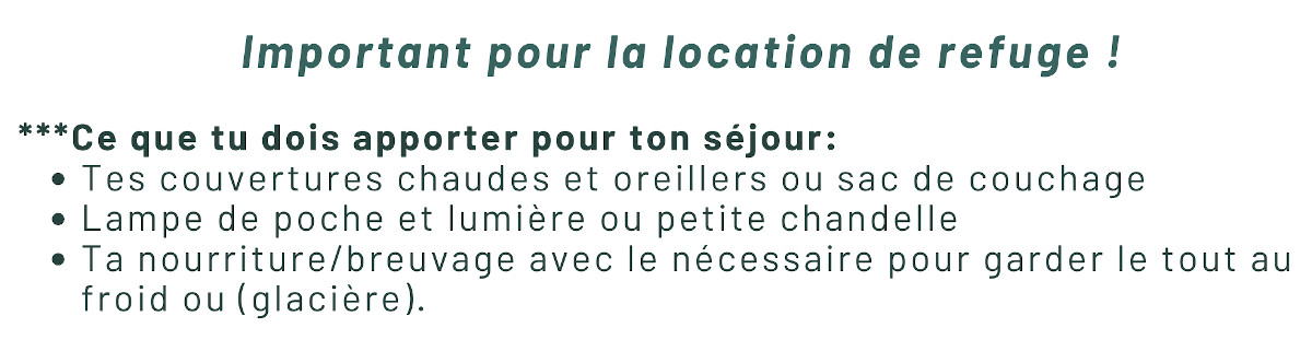 **Ce que tu dois apporter pour ton séjour en refuge : tes couvertures chaudes et oreillers ou sac de couchage, ainsi que lampe de poche et lumière ou petite chandelle, nourriture en sac pour garder au froid ou glacière.